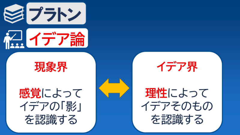 - 感覚を通じて感じ取れる個々のものはイデアの不完全な影(コピー)にすぎない