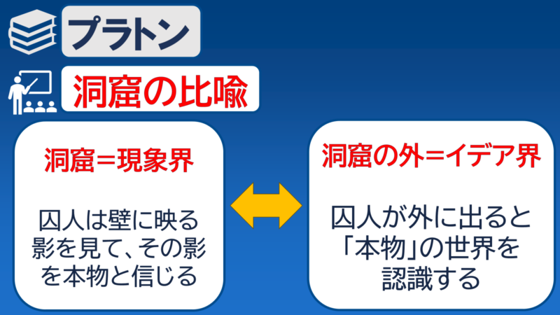 プラトンの洞窟の比喩は、彼の哲学を説明する際によく用いられる有名なたとえ話です。