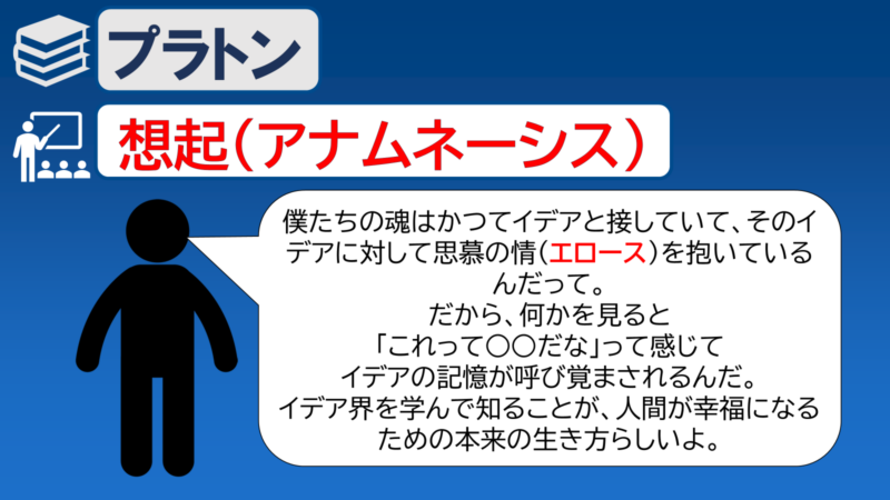 人間の魂は生まれる前にイデアを知っていました。しかし、身体という牢獄に閉じ込められた際にイデアを忘れてしまいます。しかし、何かを見て「これって○○だな」と感じたとき、イデアの記憶が呼び覚まされます。これを想起(アナムネーシス)と呼ぶのです。