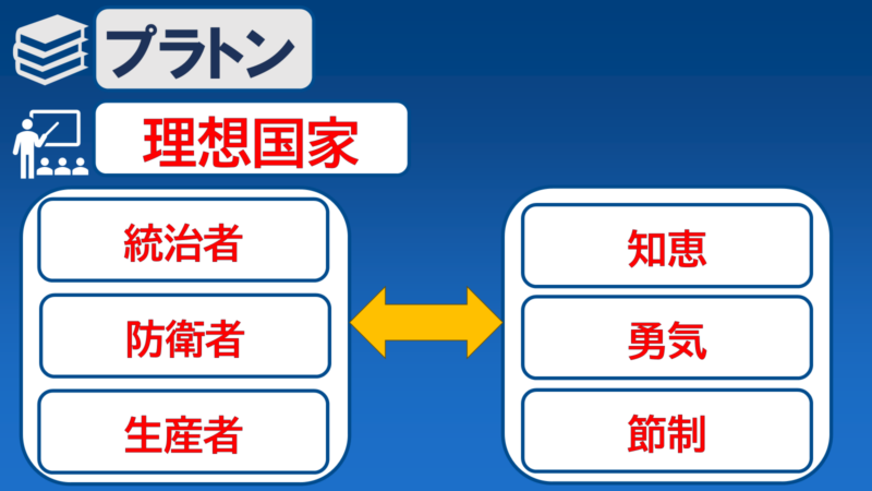 プラトンは国家について、統治者、防衛者、生産者という3つの階級に分けます。そしてそれぞれについて、身につけるべき徳があるとしました。