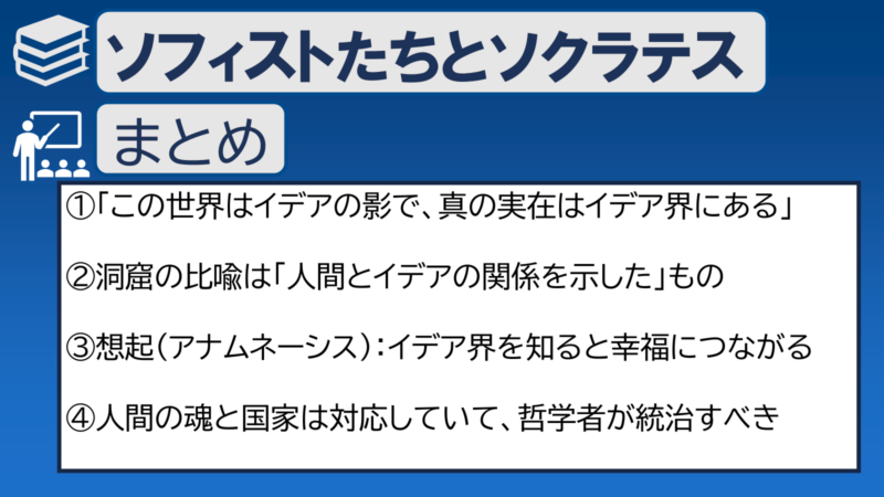 プラトン、イデア論、洞窟の比喩、アナムネーシス(想起)、現象界、イデア界、魂の三部分、国家の三階級、理想国家、四元徳、哲人政治