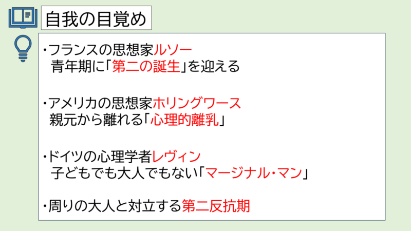 - ルソーは「第二の誕生」、ホリングワースは「心理的離乳」、レヴィンは「マージナル・マン」と青年期について述べている!