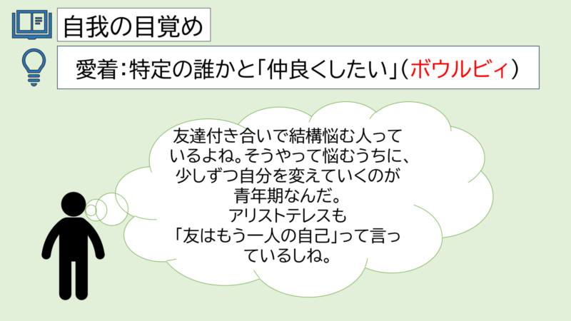 一方で、青年期や成人期ではこの愛着の対象が友人や恋人に移行していくといいます。そして、この友人づきあいなどを通して、青年は自らがどのような人間なのか、どのような人間に見えるのかを知ることになります。このような一面について、アリストテレスは「友はもう一人の自己(第二の自己」という言葉を残しています。単に友達と話しているだけでも、青年はもう一人の自分を鏡に映したかのように見つめているというわけです。