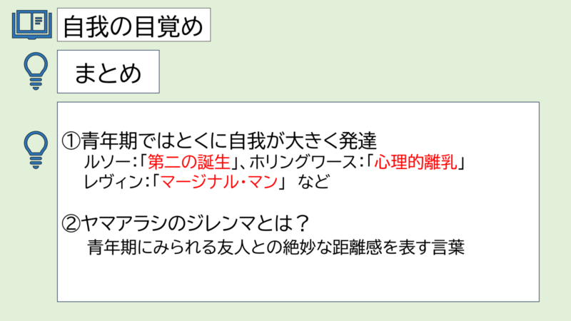 - 自我の目覚めに関する問題について、共通テストレベルの問題を解けるようになる。